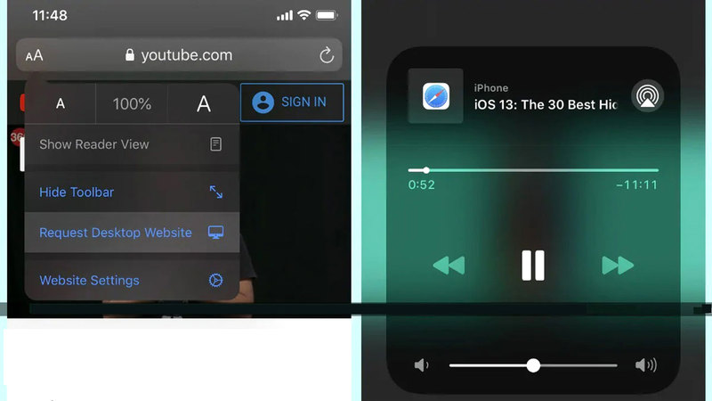 ومع ذلك، فإنه لايزال بمقدور المستخدم الاستفادة من هذا الملمح عن طريق اتباع بعض الأمور البسيطة. فإذا كنت من مستخدمي هواتف «آي فون»، فإنه يمكنك تشغيل فيديوهات «يوتيوب» في الخلفية باتباع الآتي: افتح متصفح «سفاري» ومنه انتقل إلى موقع «يوتيوب»، وبعد اكتمال تحميل الصفحة، انقر فوق الأيقونة التي تحمل شكل حرف «aA» في الجانب الأيسر من شريط العناوين أعلى الشاشة، ثم مرر داخل النافذة المنسدلة وانقر فوق خيار «موقع الحاسبات المكتبية» Request.Desktop Website، ومن ثم ابحث الآن عن أي فيديو تريده وقم بتشغيله، وانتقل إلى الصفحة الرئيسة للهاتف Home Screen بعد التشغيل، ثم مرر للأسفل من الجانب الأيمن للشاشة في الهواتف التي تحتاج إلى «بصمة الوجه»Face ID، أو مرر من أسفل الشاشة للأعلى في الهواتف التي لا تتضمن هذا الملمح، وذلك للوصول إلى «مركز التحكم» Control Centre، وستشاهد بموجب ذلك المربع الخاص بأدوات التحكم الموسيقي في أعلى يمين النافذة، وعندها انقر فوق زر «التشغيل» Play لاستئناف تشغيل الفيديو في الخلفية.