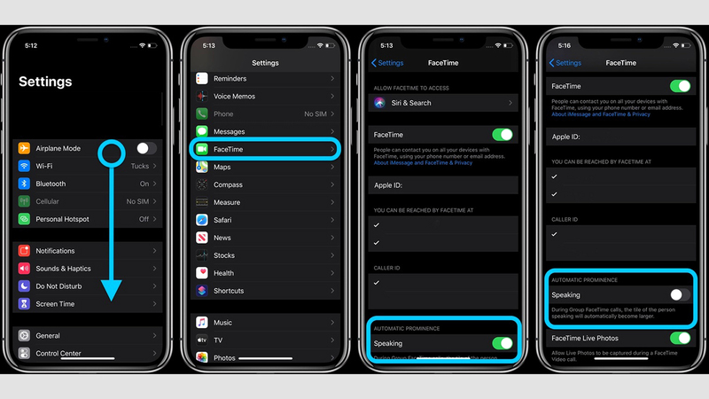 فإذا كنت من مستخدمي الإصدار التجريبي من نظام التشغيل «Ios 13.5»، اتبع الخطوات التالية لإيقاف حركة المتحدثين في Facetime: افتح تطبيق «الإعدادات» Settings الذي تبدو الأيقونة الخاصة به في شكل ترس رمادي، ومرر للأسفل حتى تصل إلى تطبيق Facetime وانقر فوقه، ثم انتقل إلى نهاية النافذة الجديدة، وابحث عن قسم «الظهور التلقائي» Automatic.Prominence، ومن ثم حرك المؤشر المجاور لخيار «التحدث» Speaking الموجود تحت القسم السابق من اليمين إلى اليسار، لإيقاف حركة الوجوه أثناء المكالمات التي تجريها المجموعات.