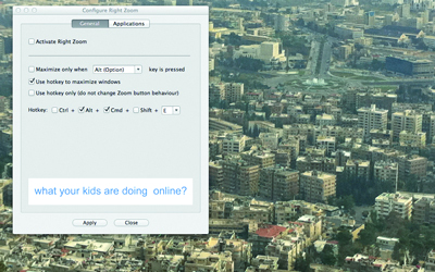 يمكن استخدام برنامج «رايت زوم» لتكبير النوافذ في ماك لتصبح في وضع ملء الشاشة مباشرةً، فبعد تنزيل البرنامج نضغط على خيار «اكتيف رايت زووم» ليتم تفعيله على جميع النوافذ، كما يمكن تفعيل البرنامج فقط عند الضغط على زر معين مثل «آلت» أو «كوماند»، وفي التبويب الثاني يمكن التحكم بالبرامج التي نرغب في تعديل زر تكبير النوافذ عليها.