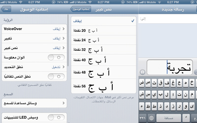وبعدها يختار المستخدم «نص كبير» أو Large Text ويحدد حجم الخط الذي يرغب فيه، ليلاحظ بعدها حجم الخط الجديد في الرسائل، والبريد الإلكتروني، والملاحظات، إضافة إلى جهات الاتصال.