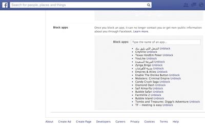 إلا أنه يمكن بكل سهولة منع أي تطبيق أو لعبة على «فيس بوك» من إرسال الدعوات من خلال الضغط على أيقونة «الإعدادات»، ومن ثم نختار من القائمة المنسدلة «إعدادات الحساب» أو Account Settings، وفي الصفحة الجديدة نختار من القائمة الموجودة على جانب الشاشة خيار «الحظر» Blocking.