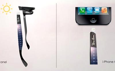 طرح المصمم سيالي كالوسكار، نموذجاً لمشروع مازال قيد التطوير حوّل بموجبه نظارة شمسية من نوع (راي بان) إلى جهاز لشحن هواتف «آي فون» من خلال إضافة ألواح شمسية على جانبي النظارة.