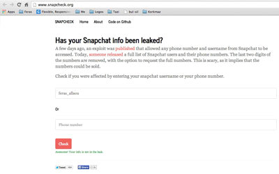 تعرضت خدمة التراسل الفوري سناب شات «Snap Chat» أكثر من مرة للاختراق، وتم على أثر ذلك تسريب بيانات ملايين المستخدمين لهذه الخدمة. ويمكن للمستخدمين التأكد من أن حسابهم قد تم تسريب بياناته من عدمه، من خلال الاستعانة بموقع «http://lookup.gibsonsec.org». من خلال الموقع يكتب المستخدم اسمه فقط لتظهر له النتيجة مباشرةً. كما يمكن الاستعانة بموقع «http://www.snapcheck.org» الذي يسمح للمستخدم بالتأكد من خلال اسم المستخدم، أو من خلال رقم الهاتف، وبمجرد الضغط على زر «Check» تظهر النتيجة فوراً.
