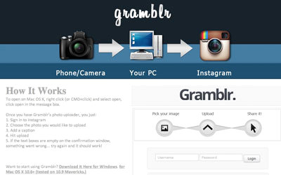 على الرغم من وجود موقع على الإنترنت لـ«إنستغرام» مُخصص لأجهزة الكمبيوتر، فإن هذه النسخة لا تسمح للمستخدم برفع الصور، بل استعراضها وكتابة تعليقات. ويمكن لمستخدمي «ويندوز 8» ومافوق الاستفادة من برنامج InPic المجاني، الذي يسمح برفع الصور على حساب «إنستغرام»، كما يمكن إنشاء حساب عبر البرنامج. ويمكن أيضاً لمستخدمي «ماك» و«ويندوز» الاستفادة من برنامج gramblr، الذي يُقدم ميزات البرنامج السابق نفسه، إلا أنه لا يتيح تطبيق تأثيرات على الصور قبل مشاركتها.