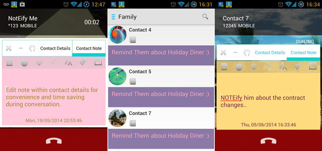 كثيراً ما يحتاج المستخدم إلى تسجيل ملاحظة أو رقم هاتف أثناء إجراء مكالمة، إلا أنه ولإتمام هذه العملية فإنه يحتاج إلى الضغط على أكثر من زر للوصول إلى تطبيق الملاحظات الموجود داخل النظام. لذا يمكن لمستخدمي «أندرويد» الاستفادة من تطبيق NOTEify المجاني المتخصص في توفير أداة لتسجيل الملاحظات أثناء إجراء أي مكالمة، إذ لا يحتاج المستخدم للضغط على أي زر. عند إجراء أي مكالمة يتم فتح نافذة لتدوين الملاحظات، والمميّز في التطبيق أن الملاحظة يتم تسجيلها ضمن معلومات الاسم الذي تجرب المكالمة معه، وتالياً لن تتداخل الملاحظات في ما بينها.