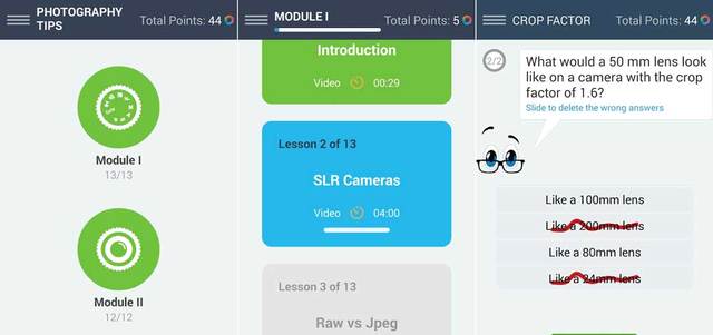 ويعمل تطبيق Learn Photography بأسلوب إعطاء دورة عبر مقاطع فيديو، واختبارات تفاعلية مع المستخدم الذي يمكنه إجراء اختبار في كل مستوى وصل إليه، كي يجتازه.