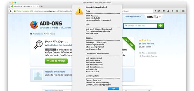 وبعد تثبيت الإضافة، يحدد المُستخدم النص ويضغط بالزر الأيمن لـ«الماوس» عليه، ويختار بعدها من القائمة Font Finder ثم Analyze selection. أخيراً، تظهر قائمة تحتوي على معلومات كاملة حول النص، مثل اللون المُستخدم، الحجم، إضافة إلى نوع الخط.