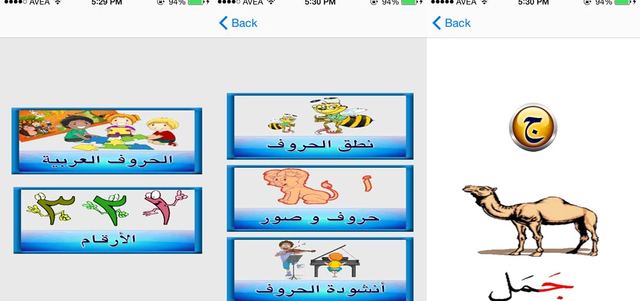 ويُمكن لمستخدمي «آي فون» الاستفادة من تطبيق Easy Arabic Alphabet العربي، الذي من خلاله يُمكن تعليم الأطفال الأرقام والحروف وطريقة نطقها، مع توفير صور لتعليم الحروف. وبعد تشغيل التطبيق تظهر قائمة للاختيار بين تعلّم الأرقام أو الحروف، وعند اختيار الحروف تظهر خيارات مثل تعلم النطق، عرض صور متعلقة بكل حرف أو تعلّم أنشودة الحروف.