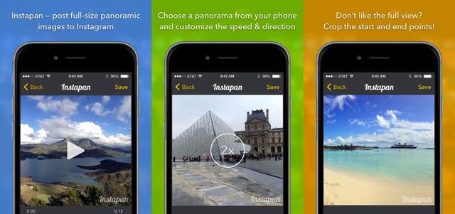 لا يسمح تطبيق «إنستغرام» افتراضياً مُشاركة الصور البانورامية التي يُمكن التقاطها افتراضياً داخل أجهزة «آي فون» لكن مُستخدمي «آي فون» بإمكانهم تجربة تطبيق Instapan المجاني الذي من خلاله يُمكن مشاركة الصور بسهولة. بعد تشغيل التطبيق يختار المُستخدم الصورة من الألبوم، ثم يحدد سرعة تحريك الصورة واتجاه الحركة. ويُمكن حفظ المقطع الجديد أو الضغط على أيقونة «إنستغرام» داخل التطبيق، لتتم مشاركة الصورة مباشرة على شكل فيديو.