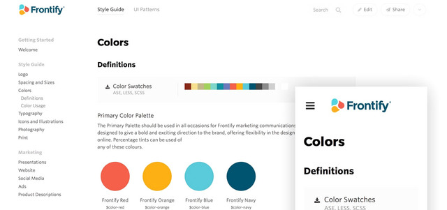 يقدم موقع Frontify طريقة مميزة من أجل عمل «دليل تصميم» جذّاب بخطوات بسيطة تتطلب بضع دقائق، إذ يمكن رفع الصور والشعارات إلى الدليل، والتعليق عليها، وتنظيمها بأسلوب مرتّب، حتى إن كانت بصيغة PSD. كما يمكن وضع قائمة بالألوان الرئيسة التي تم استخدامها في هوية التصميم، ما يسمح للمطّلع على الدليل بأن يتعرّف إلى هذه الألوان، فضلاً عن إمكانية إضافة الخطوط بسهولة من مقدمي خدمات الخطوط السحابية بما في ذلك Google Web Fonts وTypekit، وإضافة أيقونات ورموز، والعديد من الميزات الأخرى.
