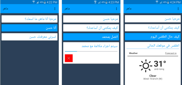 لكن لحسن الحظ أصبح هناك تطبيق عربي هو «ماهر المساعد العربي»، وهو تطبيق خاص بأجهزة أندرويد، وأقرب ما يكون إلى مساعد شخصي، يمكن للمستخدم أن يسأله عن الأخبار والطقس، واتجاه القبلة ومواقيت الصلاة، بالإضافة إلى العديد من الأسئلة المفيدة والمهمة.