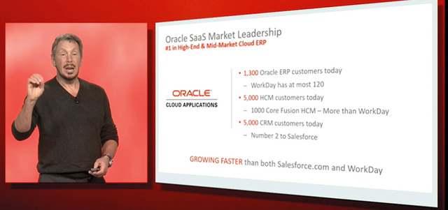 وكشف إليسون عن خدمات وتطبيقات سحابية جديدة، بما في ذلك أداة للتدريب تتكامل مع تطبيقات الموارد البشرية في الشركة، كما قام بإعطاء لمحة عن استراتيجية الشركة الأمنية. وقام إليسون بانتقاد كل من شركتي «آي بي إم» و«ساب» IBM and SAP قائلاً إن «شركة (أوراكل) لم يعد لديها أي اهتمام بكلتا الشركين»، مضيفاً أن «الشركتين تمثلان اثنتين من أكبر المنافسين لنا، وقمنا بتتبعهما بشكل قريب على مدى العقدين الماضيين، إلا أنه لم يعد يهمنا الالتفات إلى أي واحدة منهما».