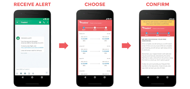 وتتم العملية عن طريق هذه الخدمة خلال ثلاث مراحل، الأولى هي عندما يصل للمستخدم تنبيه يخبره بأن هناك تغييراً حدث مع الرحلة الخاصة به، ليتمكن بعد ذلك من اختيار رحلة جديدة عن طريق هاتفه، ومن ثم ببساطة يمكن له تأكيد حجز الرحلة الجديدة ليتم الأمر بهذه البساطة.