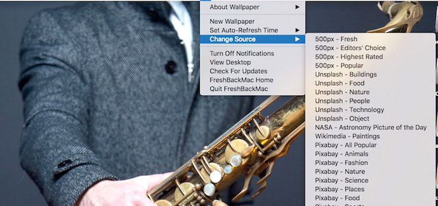 يوفّر التطبيق إمكانية اختيار مصادر الصور من بين مجموعة مصادر متنوعة ومشهورة في تقديم صور مجانية عالية الدقة، مع إمكانية اختيار نمط الصور ونوعها، إذ يمكن اختيار صور طبيعة، أو أماكن، أو حيوانات أو أطعمة أو غير ذلك الكثير، مع إمكانية تحديد الوقت الذي يتم فيه تبديل الخلفية تلقائياً، وكل ذلك من أيقونة موجودة في شريط القوائم.