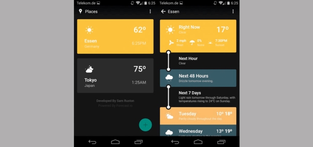 ويعمل التطبيق على تلخيص حالة الطقس خلال مدد مختلفة، منها الساعة الحالية، وخلال 48 ساعة مقبلة، وخلال أسبوع مقبل أيضاً.