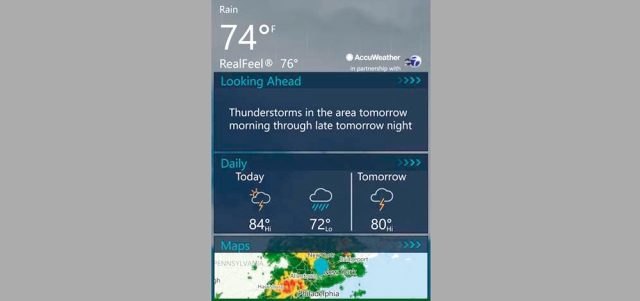ويتضمن التطبيق شاشة تفاعلية تضم «خرائط بينغ» Bing Maps، ويتم مدها لحظياً ببيانات الطقس، خصوصاً في الولايات المتحدة وكندا وأوروبا واليابان.