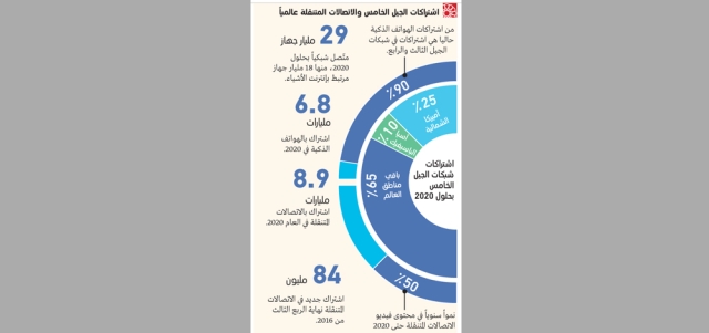 وأضاف أن «هناك اهتماماً كبيراً لدى مشغلي الخدمات، في ما يتعلق بإطلاق شبكات الجيل الخامس في مرحلة قبل التوحيد»، لافتاً إلى أنه «من شأن شبكات الجيل الخامس أن تسرّع عجلة التحول الرقمي في العديد من القطاعات، ما يفسح المجال أمام حالات استخدام جديدة في مجالات مثل إنترنت الأشياء، والأتمتة، والنقل». وتوقع تقرير «الاتصالات المتنقلة» أن يكون هناك 8.9 مليارات اشتراك بالاتصالات المتنقلة في عام 2020، موضحاً أن 90% منها مخصص للاتصالات المتنقلة عريضة النطاق.