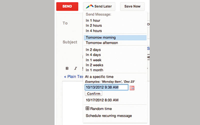 ثم انقر فوق النتيجة الأولى التي ستظهر والخاصة غالباً بموقع الإضافة نفسها، وستتأكد من ذلك لو لاحظت أن الجزء الأول من عنوان الـ«ويب» الخاص بالموقع هو www.boomeranggmail.com. وفي بداية الصفحة سترى زراً أحمر اللون يحمل عبارة: INSTALL BOOMERANG، انقر فوقه، لتظهر نافذة جديدة تضم في نهايتها خيارين، وهنا يجب النقر فوق الخيار الأول منهما الخاص بإلحاق هذه الإضافة بالمتصفح ADD EXTENSION. وكل ما عليك الآن هو كتابة الرسالة التي ترغب فيها، ثم النقر فوق زر الإرسال في وقت لاحق SEND LATER، وعندها ستظهر نافذة تضم مجموعة من التوقيتات الزمنية التي يمكنك إرسال الرسالة فيها، كأن تختار إرسالها بعد ساعة أو ساعتين، أو صباح الغدTOMORROW MORNING، أو حتى بعد شهر، كما يمكن تحديد تاريخ ووقت معين، ثم النقر فوق زر التأكيد CONFIRM.
