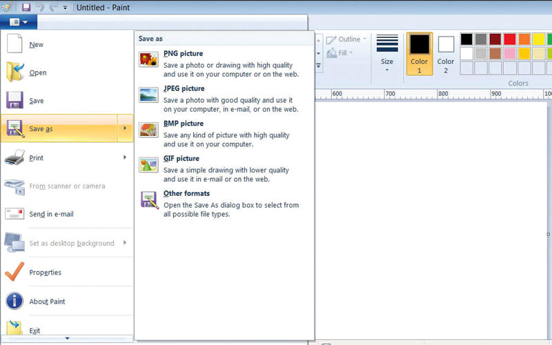 عندما تنتهي من إجراء التغييرات التي ترغب فيها على الصور في برنامج paint، أو تنتهي من إعداد لوحة خاصة بك، تأتي مرحلة حفظ الصورة. ولمعرفة أنسب الصيغ التي يمكن حفظ الصورة من خلالها، ينصح الخبراء بالتعرف بداية على الغرض الذي ستستخدم فيه الصورة. ويمكنك إجراء ذلك من خلال ما يلي: بعد الانتهاء من إجراء التغييرات المطلوبة، انقر فوق رأس السهم المقلوب المجاور للقائمة الرئيسة للتطبيق أقصى يسار الشاشة، ثم انقر الخيار الرابع في القائمة وهو زر الحفظ بصيغة معينة save as، لتظهر نافذة جديدة تضم خيارات عدة، فإذا كانت الصورة التي ترغب في حفظها مليئة بالألوان، أو كنت تعمل في مجال التصوير الاحترافي، فيمكنك النقر فوق زر حفظ الصورة بصيغة jpg. أما إذا كانت الصورة ذات ألوان قليلة ولا تحتوي على الكثير من التفاصيل، فيمكنك النقر فوق حفظ الصورة بصيغة gifs لأن أحجام ملفاتها صغيرة. وفي حال كنت تخطط فقط لاستخدام الصورة في برنامج paint، يمكن النقر على زر حفظ الصورة بصيغة bmp وهي الصيغة الافتراضية لحفظ الصور في البرنامج.