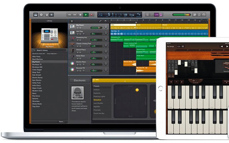 Garage Band يعد استوديو كاملاً لتأليف الموسيقى داخل «ماك»، مع مكتبة أصوات كاملة تتضمن أدوات موسيقية برمجية، وضبطاً مسبقاً للغيتار والصوت، وأداة طبول افتراضية.