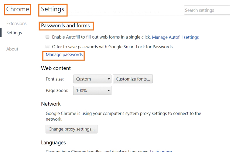 يمكن للبعض التعرف إلى كلمات المرور الخاصة بك من المتصفح الذي تستخدمه، لكن إذا كنت من مستخدمي «غوغل كروم»، يمكنك حذف الكلمات المحفوظة في المتصفح، من خلال ما يلي: افتح «كروم»، ثم توجه إلى قائمة المزيد، وانقر فوقها، وبعدها مرر للأسفل داخل القائمة التي ستظهر حتى تصل إلى «الإعدادات» settings ثم انقر فوقها. وعندها مرر داخل الصفحة الخاصة بالإعدادات، حتى تصل إلى نهايتها، ثم انقر خيار «إظهار الإعدادات المتقدمة» show advanced settings. وهنا ابحث عن القسم الخاص بـ«كلمات المرور والنماذج»Passwords and forms، ثم انقر خيار «إدارة كلمات المرور»Manage passwords، لتظهر نافذة تحتوي كلمات المرور المحفوظة.
