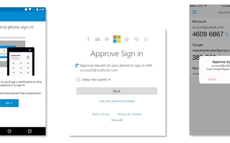 وأوضحت الشركة الأميركية أنها تعتمد على تطبيق أداة المصادقة Authenticator، الذي يتم فيه تخزين حساب «مايكروسوفت»، كما يتم تحديد تسجيل الدخول عن طريق الهاتف. وأضافت أنه إذا سجل المستخدم الدخول في خدمة البريد الإلكتروني Outlook.com بواسطة اسم المستخدم، فإنه يتم إرسال رسالة إلى الهاتف الذكي، وبعد ذلك يؤكد المستخدم محاولة تسجيل الدخول، مشيرة إلى أنه يتم الوصول إلى رسائل البريد الإلكتروني الخاصة به دون إدخال كلمة مرور، لكنها أكدت على استمرار إمكانية تسجيل الدخول بواسطة كلمة المرور.
