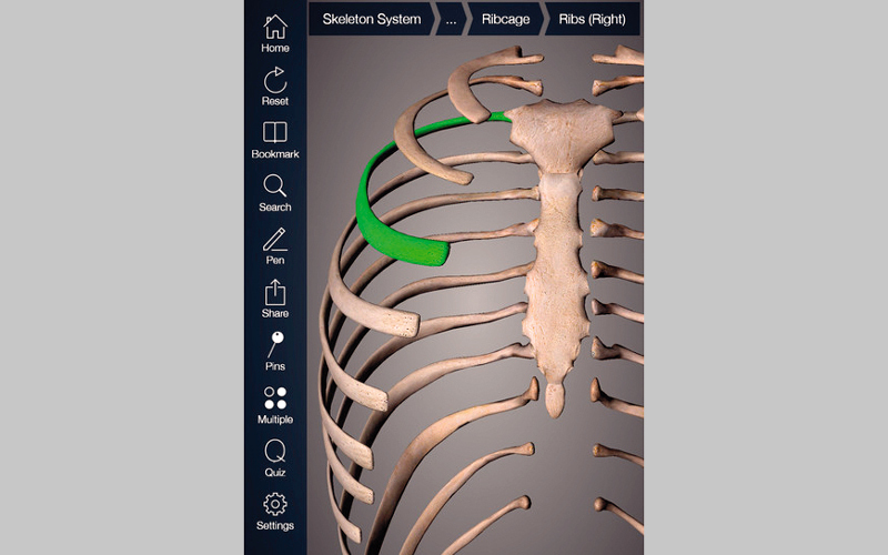 ويسمح أيضاً باختيار مناطق معينة من الهيكل العظمي للاطلاع عليها بشكل تفصيلي، فضلاً عن إمكانية حفظ المقاطع التي تهم المستخدم في قائمة التفضيلات.