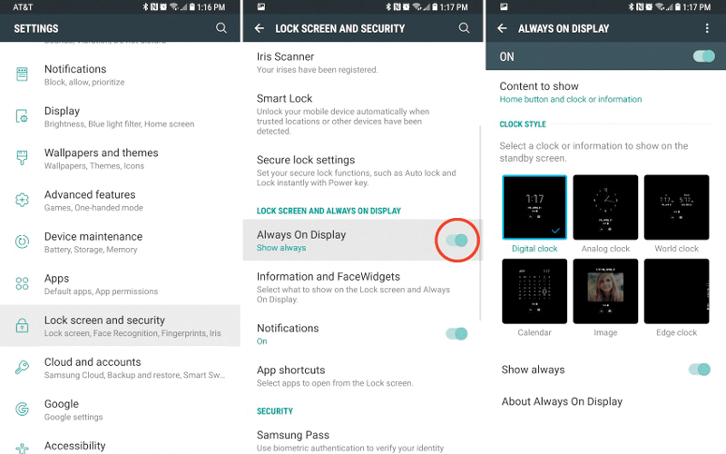 تتميز هواتف «غالاكسي نوت 8» بشاشتها المميزة، ومن أبرز الملامح المتعلقة بهذه الشاشة ملمح العرض الدائم ALWAYS ON DISPLAY لبعض المعلومات الرئيسة التي يحتاج المستخدم إلى الوصول لها بسرعة، وعلى رأسها التاريخ واليوم والساعة ونسبة الشحن في البطارية والتنبيهات.