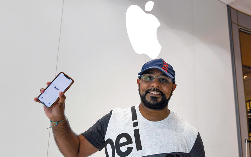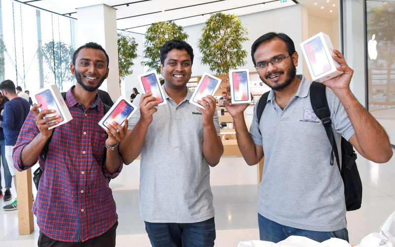 شهدت متاجر «شركة أبل الأميركية»، في أسواق الدولة، أمس، ازدحاماً وطوابير انتظار طويلة، في اليوم الأول للطرح الرسمي لهاتفها الجديد «آي فون إكس» أو «آي فون 10».