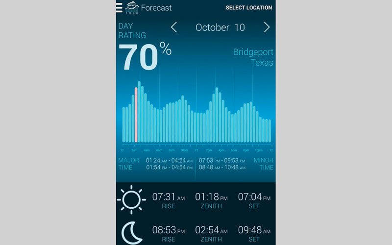 ويعرض التطبيق أيضاً أفضل أوقات الصيد اعتماداً على مراحل وأوضاع القمر، وموقع الشمس بالنسبة للأرض، ومن ثم التخطيط لرحلات الصيد بشكل مدروس، فضلاً عن تحديد مواعيد شروق وغروب الشمس، وظهور القمر واختفائه.