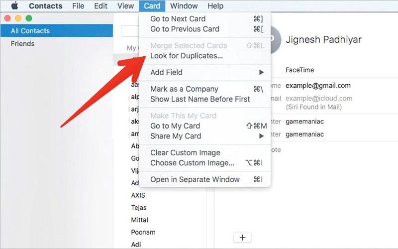 قائمة view في أعلى النافذة، ثم انقر داخل النافذة المنسدلة فوق خيار «عرض المجموعات» Show Groups، وعندها توجه إلى قائمة «البطاقة» card في أعلى الشاشة وانقر فوقها، ومن النافذة المنسدلة التي ستظهر انقر خيار «ابحث عن التكرار» Look for Duplicates، لتظهر نافذة تضم العدد الإجمالي للبطاقات المكررة، حيث تحتوي هذه البطاقات على الأسماء نفسها لكن مع بعض المعلومات المختلفة، أو المعلومات والأسماء ذاتها، وبعد ذلك انقر خيار الدمج في نهاية الجانب الأيمن من النافذة لتدمج الأسماء والمعلومات المتكررة.