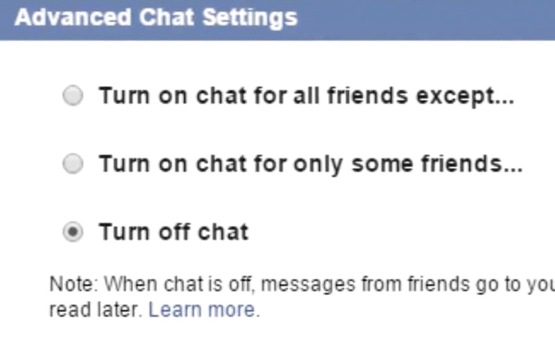 افتح نافذة الدردشة عبر «فيس بوك»، وتجدها في نهاية الصفحة، ثم توجه إلى ترس «الإعدادات» settings في أعلى نافذة الدردشة وانقر فوقه، ومن النافذة المنسدلة التي ستظهر أمامك، انقر فوق خيار «إعدادات الدردشة المتقدمة»، ومن ثم ضع علامة التأشير داخل الدائرة الصغيرة المجاورة للخيار الأول الخاص بإيقاف تشغيل الدردشة لبعض جهات الاتصال فقط، وعندها اكتب داخل حقل النص الظاهر أمامك تحت الخيار السابق، أسماء الأشخاص الذين ترغب في عدم الظهور لهم أثناء نشاطك عبر «فيس بوك».