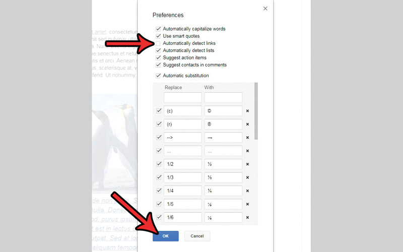 توجه إلى موقع تطبيق «غوغل درايف» Google Drive عبر الرابط: https:/‏‏/‏‏drive.google.com/‏‏drive/‏‏my-drive ثم سجل الدخول sign in إلى حسابك، ومن ثم افتح أياً من الوثائق التي أعددتها باستخدام تطبيق «مستندات غوغل»، وبعدها توجه إلى شريط القوائم العلوي، ثم انقر قائمة «الأدوات» tools ومرر للأسفل داخل النافذة المنسدلة حتى تصل إلى خيار «التفضيلات» Preferences، وانقر فوقه. وبعدها مرر للأسفل مجدداً داخل النافذة الجديدة حتى تصل إلى الخيار الخاص بالكشف التلقائي عن روابط الويب Automatically detect hyperlinks، ثم امحُ علامة التأشير من المربع الصغير المجاور للخيار السابق، وانقر زر «الموافقة» ok.