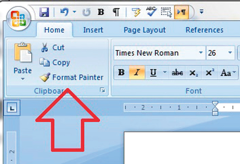 انقر فوق خيار format painter، وستلاحظ تحول مؤشر الـ«ماوس» إلى شكل فرشاة، وهنا انتقل إلى جزء النص الذي ترغب في تطبيق التنسيق نفسه عليه، ومرر فوقه مؤشر الـ«ماوس».