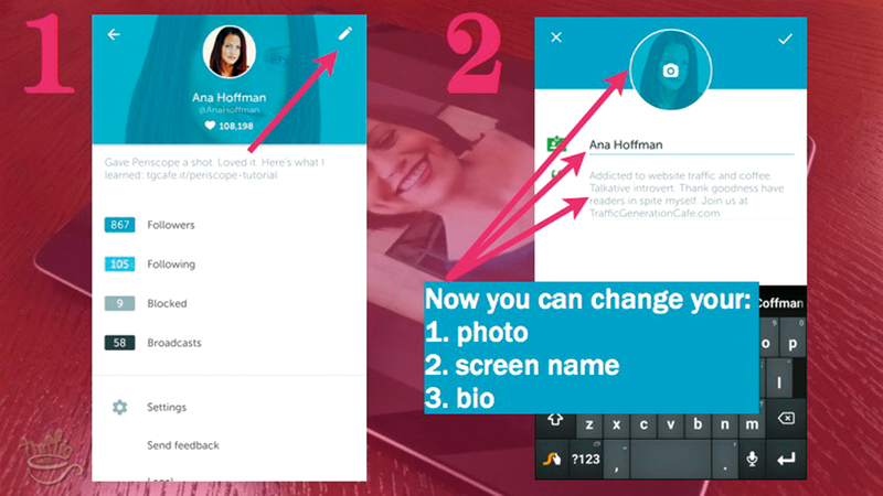 فإذا كنت من مستخدمي تطبيق «بيريسكوب»، ورغبت في إعادة تعديل ملفك الشخصي في التطبيق، اتبع ما يلي: افتح التطبيق وانقر أيقونة «الأشخاص» People التي تبدو في شكل مجموعة من الأشخاص في نهاية الجانب الأيمن من الشاشة، ثم انقر أيقونة ملفك الشخصي، وتجدها في أعلى الجانب الأيمن من تبويب الأشخاص، وبعدها انقر أيقونة «التحرير» edit الموجودة أيضاً في أعلى يمين النافذة، وتبدو في شكل قلم صغير، ثم أدخل التعديلات التي ترغب في إجرائها، سواء الصورة أو الاسم أو التعريف، وعندما تنتهي، انقر زر «تم» done ذا اللون الأزرق في منتصف النافذة.