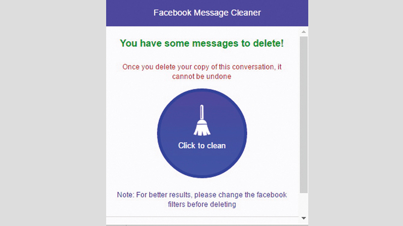 يستعين بعض مستخدمي شبكة فيس بوك بالملحقات التي تضاف للمتصفحات، لتؤدي مهمة إلغاء الرسائل دفعة واحدة. فإذا كنت من مستخدمي «متصفح كروم»، يمكنك الاستعانة بالإضافة المعروفة باسم: Facebook Message Cleaner للتخلص من كل الرسائل في مرة واحدة وفقاً لهذه الخطوات: