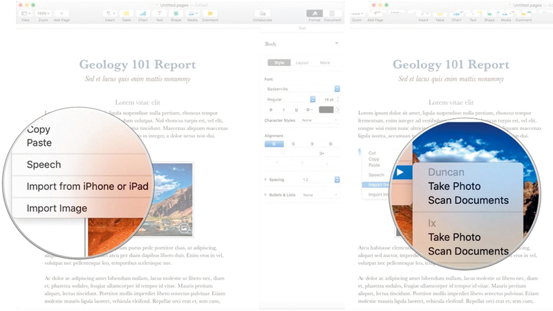 وأوضحت المجلة أنه بالنسبة للصور، فإنه يتعين على المستخدم فتح قائمة السياق في Finder، وتحديد بنود استيراد من «آي فون» أو «آي باد» / التقاط صورة (Import from iPhone or iPad/Take Photo)، وبعد ذلك يتم تشغيل هاتف «آي فون» في وضع الكاميرا، مشيرة إلى أنه بمجرد التقاط الصورة، يمكن للمستخدم تكرار اللقطة أو تحديد الصورة وإرسالها إلى مجلد Finder المعني، كما أن الوظيفة ذاتها تتوافر لتطبيقات Mail وPages.