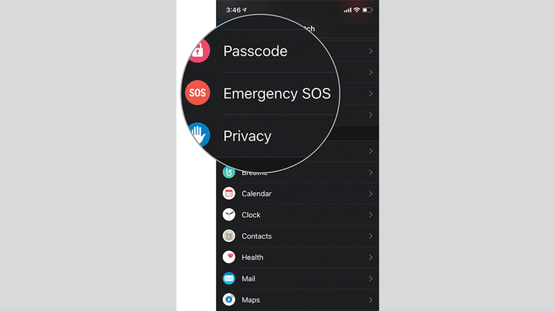 مرر للأسفل ثم انقر فوق قسم: «الاستغاثة بخدمة الطوارئ» Emergency SOS، ثم ابحث داخل نافذة الطوارئ عن خيار: «استشعار السقوط» Fall Detection بقرب نهاية النافذة، وحرك المؤشر المجاور للخيار السابق من اليمين لليسار حتى يختفي الضوء الأخضر.