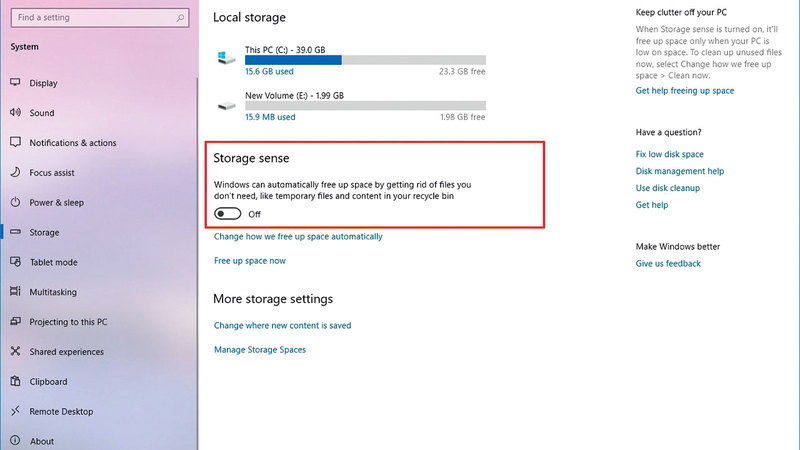 عندما يلاحظ المستخدم أن حاسبه الذي يعمل بنظام التشغيل «ويندوز 10» أصبح أبطأ من ذي قبل، يتبادر إلى ذهنه أن هذا الأمر يعود إلى تراجع مساحة التخزين على الجهاز، ومن ثم يرغب في زيادة المساحة الخالية عن طريق التخلص من بعض المحتوى. وتتعدد الطرق التي يمكن الاستعانة بها لتنفيذ هذه المهمة. فإذا كنت من مستخدمي «ويندوز 10» ورغبت في التخلص من بعض المساحة على أقسام القرص الصلب عن طريق حذف بعض الملفات، فاتبع ما يلي: انقر قائمة «ابدأ» في نهاية الجانب الأيسر من الشاشة، ثم انقر أيقونة قائمة الإعدادات، من ثم انقر فوق قسم «النظام» system داخل النافذة الجديدة، ومرر داخل الجانب الأيسر من النافذة التالية لتصل إلى «قائمة التخزين» storage، وبعدها انتقل إلى الجانب الأيمن من النافذة وحرك المؤشر الموجود تحت خيار Storage sense من اليسار إلى اليمين لتفعيله، وبموجب ذلك سيحرر نظام التشغيل تلقائياً بعض المساحة بالتخلص من الملفات التي لا تحتاج إليها، كالملفات المؤقتة والمحتوى الموجود في سلة المهملات.