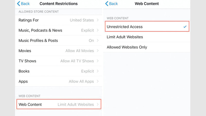أحياناً لا يجد بعض مستخدمي متصفح «سفاري» «زر التصفح الشخصي» Private button، ولا يعرفون سبب المشكلة. والحقيقة أن هذا قد يعود إلى تغييرات يجريها المستخدم، منها التغيير في إعدادات ملمح وقت الشاشة الخاص بتقييد بعض أنواع المحتوى، فإذا عانيت من هذه المشكلة، فاتبع الآتي لحلها: افتح تطبيق الإعدادات ومرر داخل النافذة التي ظهرت حتى تصل إلى تبويب «وقت الشاشة» Screen Time وانقر فوقه، ثم مرر للأسفل وانقر خيار «قيود الخصوصية والمحتوى»Content and Privacy Restrictions، ومن ثم انقر خيار «قيود المحتوى» Content Restrictions، وبعدها مرر داخل النافذة الجديدة حتى تصل إلى خيار «محتوى الويب» Web Content، ثم انظر إلى الإذن الموجود أمامه، فإذا كان هو الحد من المواقع الخاصة بالكبار أو المواقع المسموح بها فقط فهنا تكمن المشكلة، لذا عليك تغيير الخيار إلى «الوصول غير المقيد» Unrestricted Access وبذلك تستعيد زر التصفح.