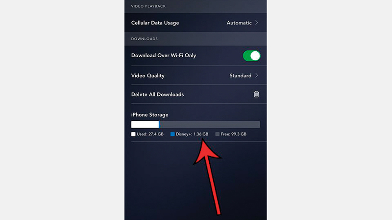 لاسيما إذا كانت تسمح للمستخدمين بتنزيل الفيديوهات والمسلسلات إلى هواتفهم، والتمتع بها من أي مكان حتى لو لم يتوافر اتصال بشبكة الإنترنت. لكن مع التنزيل المستمر لهذه المواد يخشى المستخدم من استنزاف ذاكرة الهاتف، خصوصاً في هواتف «آي فون» التي تتسم بحجم ذاكرة محدود. فإذا كنت من مستخدمي تطبيق (Disney +) يمكنك الاطلاع على حجم مساحة التخزين التي يشغلها التطبيق في ذاكرة الهاتف باتباع ما يلي: افتح التطبيق الذي تبدو الأيقونة الخاصة به في شكل شعار «ديزني» مرسوم فوق أرضية زرقاء، ثم توجه إلى نهاية الجانب الأيمن من الشاشة وانقر فوق أيقونة ملفك الشخصي، ومن ثم ابحث داخل النافذة الجديدة عن خيار «إعدادات التطبيق» App Settings وانقر فوقه، وبعدها مرر مجدداً داخل النافذة التالية حتى تصل إلى قسم «مساحة التخزين على الهاتف»،iPhone Storage، وعندها ستلاحظ أن مساحة الذاكرة مقسمة إلى ثلاثة أجزاء، الجزء الأول ذو اللون الأبيض يدل على المساحة المستخدمة، فيما الجزء الرمادي يدل على المساحة الفارغة، أمّا المساحة التي يقتطعها تطبيق «ديزني» فستظهر أمامك باللون الأزرق، وأسفل الشريط تقدير رقمي لهذه المساحة.