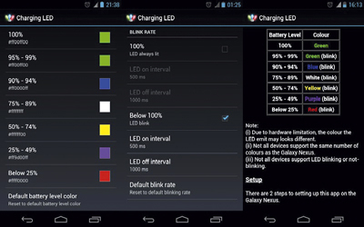 ولذلك، فإنه يمكن الاستعانة بتطبيق Charging LED الذي يسمح للمستخدم بتحديد لون الضوء عند وصول الشحن إلى درجات مختلفة، إذ يمكن تخصيص لون عند الوصول إلى 25% من الشحن، ولون آخر عند الوصول إلى 50% وهكذا.