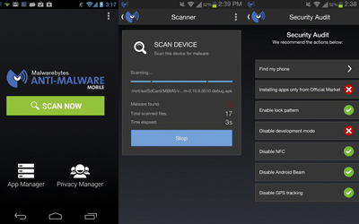 يمكن لمستخدمي أجهزة «أندرويد» الاستعانة بتطبيق «Malwarebytes Anti-Malware» المجاني، الذي يفحص الجهاز للتأكد من خلوه من التطبيقات الخبيثة. بعد تشغيل التطبيق يضغط المستخدم على زر «Scan Now» ليبدأ فحص الجهاز، أو يمكن اختيار «App Manager» للاطلاع على جميع التطبيقات.