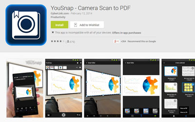 عند حضور محاضرات تدريبية أو مؤتمرات، يستعرض بعض المحاضرين عروضاً تقديمية على لوح أبيض، والتي تلخص بدورها أبرز ما جاء في المحاضرة، وقد يحتاج المستخدم إليها. ولذلك، فإن تطبيق YouSnap المتوافر على متجر «غوغل بلاي» يقوم مجاناً بتنسيق هذه الصفحات بعد التقاطها بشكلٍ مائل، ويقصّها وينسقها لتصبح كما لو أنها صورة مباشرة للعرض التقديمي. ويعمل هذا التطبيق على تحويل هذه الصور إما إلى صيغة jpg أو صيغة pdf ليتمكن المستخدم من استعراضها كما يناسبه.