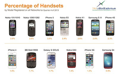 وفيما يخص أنواع الهواتف، فقد استمر هاتف "نوكيا 101/1010" في احتلال المرتبة الأولى بين الهواتف الأكثر استخداماً في الإمارات، خلال الربع الأخير من العام بنسبة 3.9٪، تبعه هاتف "نوكيا 1280/1282"، الذي احتل المركز الثاني بنسبة 3.6%، ثم هاتف "آي فون 5" بنسبة 3.0%، و"نوكيا E5" بنسبة 2.9%، ثم "نوكيا X1" بنسبة 2.8% " و"سامسونغ إس 3" بنسبة 2.6٪ و"آي فون 4 إس"، بنسبة 2.3٪، و"آي فون 4" بنسبة 1.8٪، ثم كل من "بلاك بير بولد 9900" و"غالاكسي إس دوس" بنسبة 1.7٪ لكلّ منهما، و"نوكيا E63"، بنسبة 1.4% و"آي فون 5 إس" بنسبة 1.2% و"سامسونغ إس 4" بنسبة 0.9%.