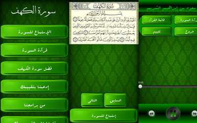 أما مستخدمي أجهزة «أندرويد» فيمكنهم الاستعانة بتطبيق «سورة الكهف | Surah Al Kahf» المجاني أيضاً، الذي يقدم وظائف تطبيق «آي فون» نفسها إلا أن يمكن يسمح بتحديد القارئ أثناء الاستماع للسورة.