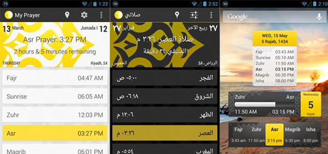 يعتبر تطبيق My Prayer أو «صلاتي» الذي يتوافر مجاناً لأنظمة تشغيل أجهزة «أندرويد» متخصصاً في مجال حساب وعرض أوقات الصلوات الخمس للمستخدم، فضلاً عن تحديد اتجاه القِبلة. كما يوفر التطبيق للمستخدمين إمكانية استخدام مربعات الشاشة الرئيسة Widgets لإضافة أوقات الصلاة، والوقت المتبقي للصلاة التالية.