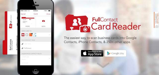 يمكن لمستخدمي أجهزة «آي فون» و«أندرويد» الاستعانة بتطبيق FullContact المجاني، الذي يقرأ محتويات أي بطاقة عمل، ومن ثم يضيف بياناتها إلى الأسماء في الجهاز، وبالتالي لن يحتاج المستخدم إلى إدخال البيانات يدوياً. كل ما يحتاجه المستخدم هو تثبيت التطبيق، ومن ثم تصوير بطاقة العمل باستخدامه، ليتم تحليل البيانات وعرض خيارات الحفظ.