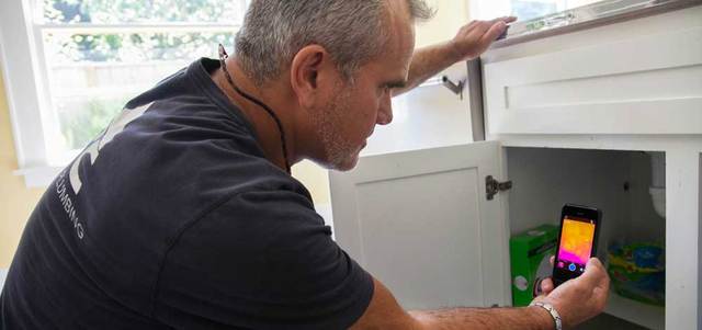 تستخدم تقنية التصوير الحراري في التعرف إلى فقدان درجات الحرارة من المباني واكتشاف التسرب في أنابيب المياه. من المصدر