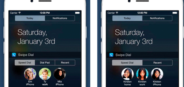 ويمكن لمستخدمي أجهزة «آي فون» الاستفادة من تطبيق Swipe Dial، الذي يتمثّل بـ«ويد غيت» يتم إضافتها في نافذة اليوم، التي تُعرف باسم Today، الموجودة في مركز التنبيهات، بحيث يمكن الوصول عادةً إلى هذه النافذة من مختلف الأماكن، وأياً كانت التطبيقات التي يستخدمها المستخدم، وذلك بمجرد السحب من أعلى الشاشة للأسفل. وهذا التطبيق يُتيح للمستخدم إمكانية إضافة جهات الاتصال المفضلة بالنسبة له ضمن «ويدجيت» خاص به، مع إمكانية إجراء تعديلات على تفاصيل هذه الجهات، مثل الصور والأسماء وغير ذلك، ليصبح بإمكانه الاتصال بها بنقرة بسيطة، دون الحاجة إلى دخول تطبيق الاتصال الرئيس، مع وجود إمكانية إضافة أزرار للاتصال، وكذلك إمكانية زيادة عدد جهات الاتصال الظاهرة ودعم اختصار لإرسال رسائل نصّية.